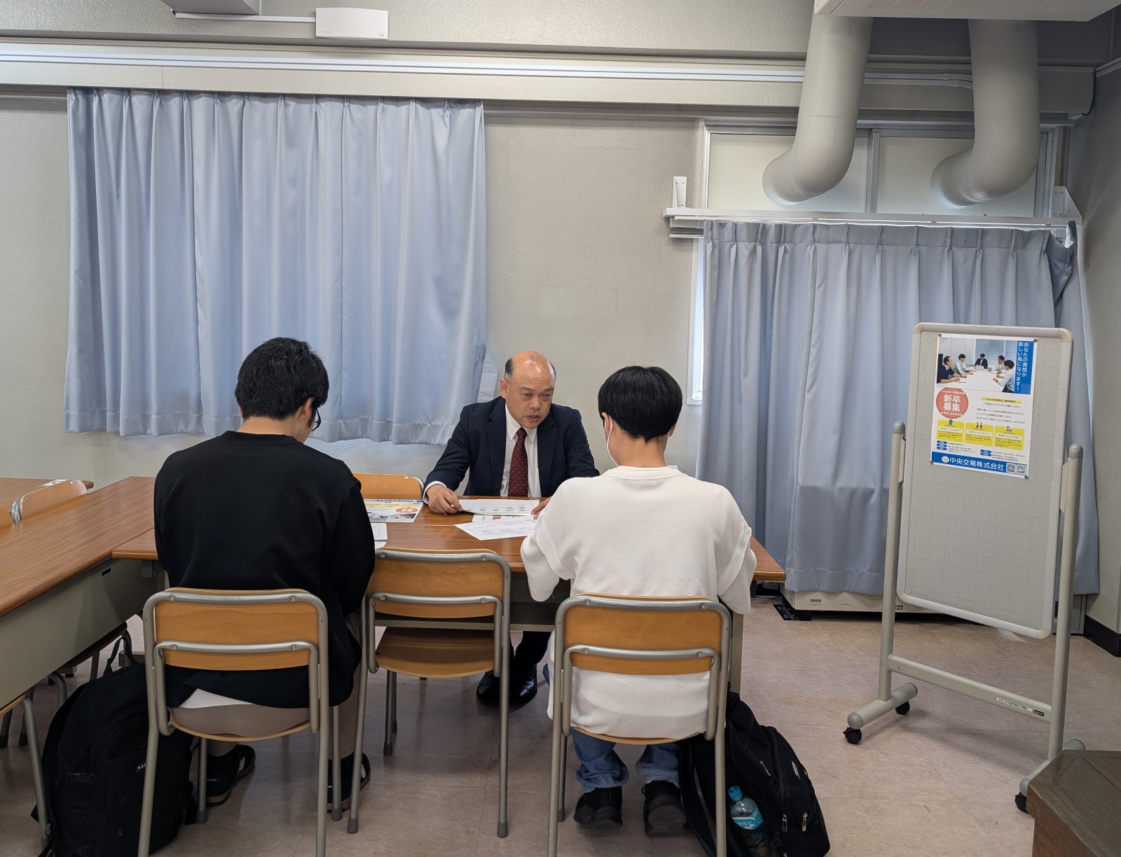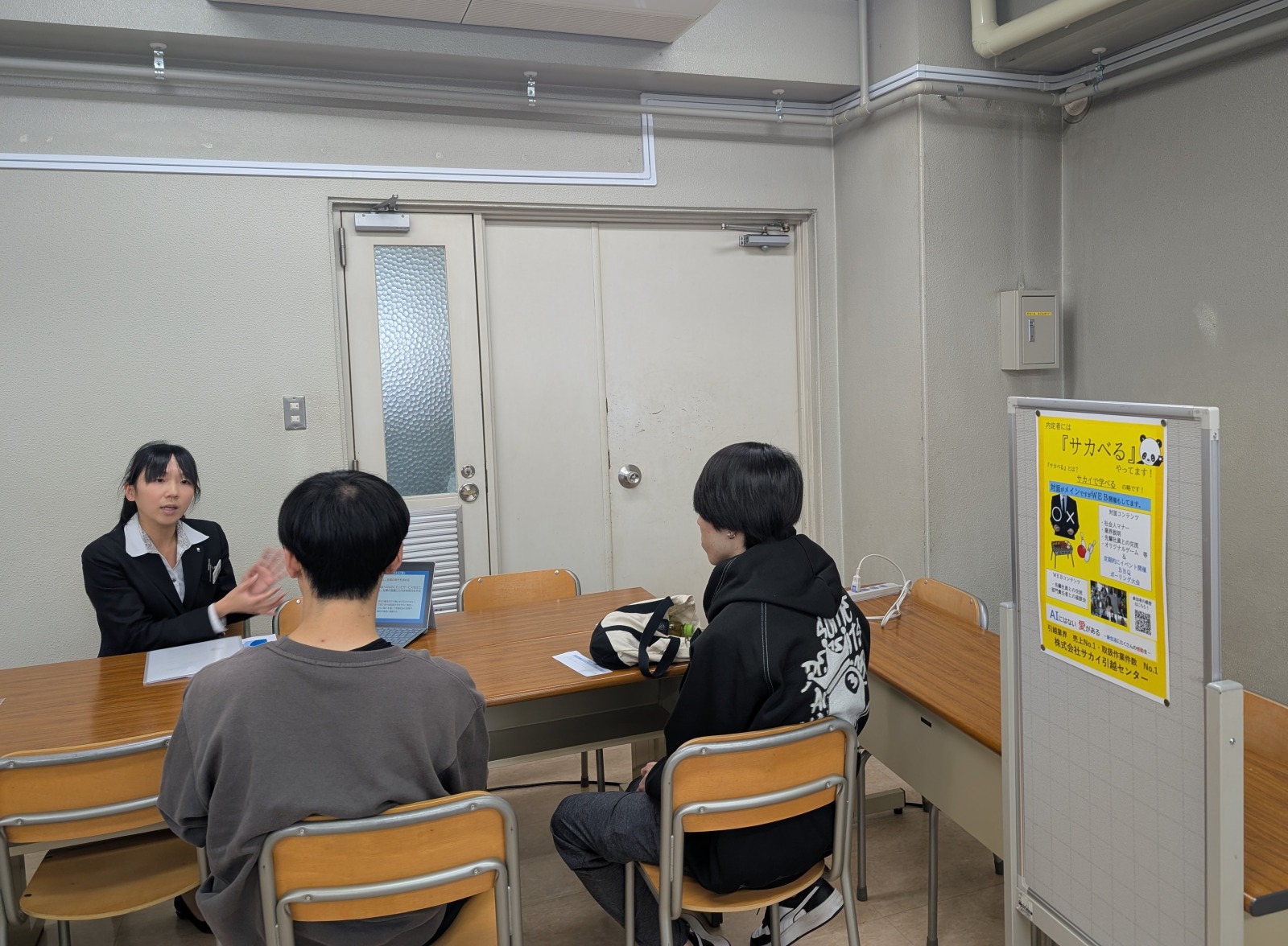 別室では、企業様に4つのコーナーに分かれていただき、合同企業懇談会を実施しました。不動産、運輸、商社、環境サービス、といったそれぞれの業界の概要説明をいただき、実際の営業職の仕事内容についてリアルな声で語っていただきました。参加学生からは、営業職に描いていたネガティブな印象がかなり払拭された、という声が多く聞かれ、これから本格化するインターンシップへの参加に勢いがついたことでしょう。